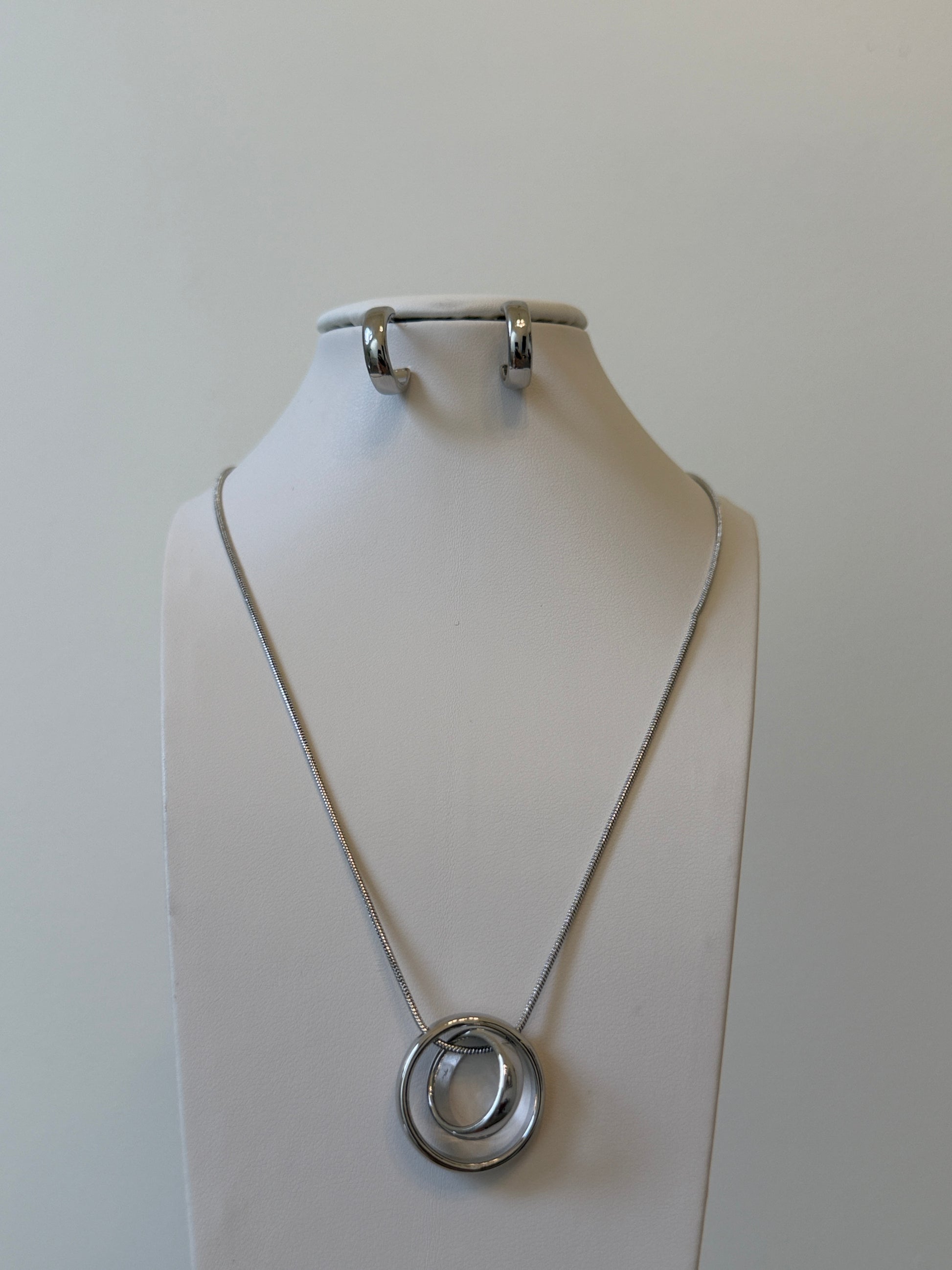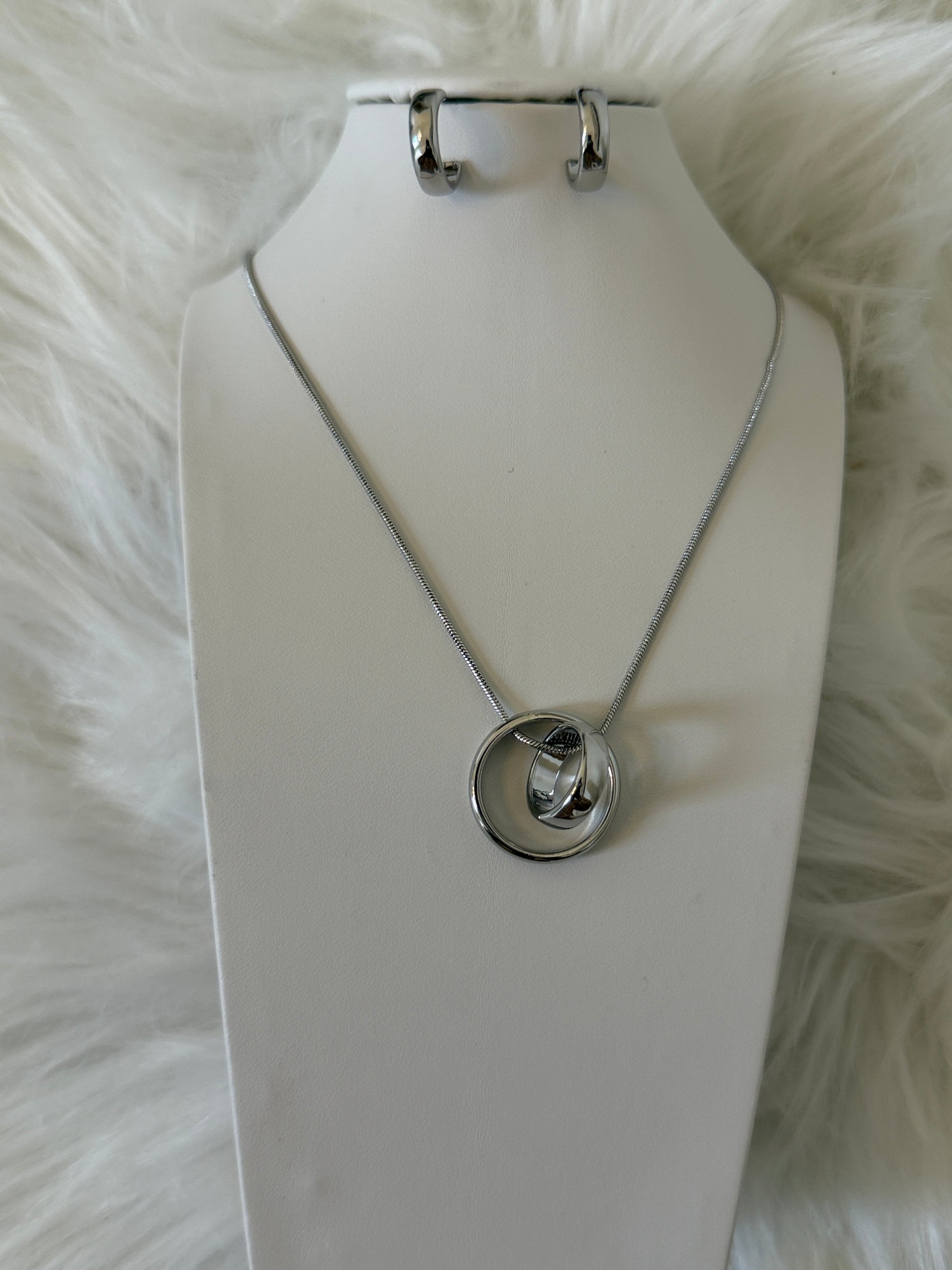 The Eternal Loop Set showcases a striking interlocking circle pendant that represents balance and continuity. Paired with sleek silver hoop-style earrings, this set delivers a bold yet refined look. Its high-shine finish and modern design make it an ideal choice for elevating both casual and evening outfits.