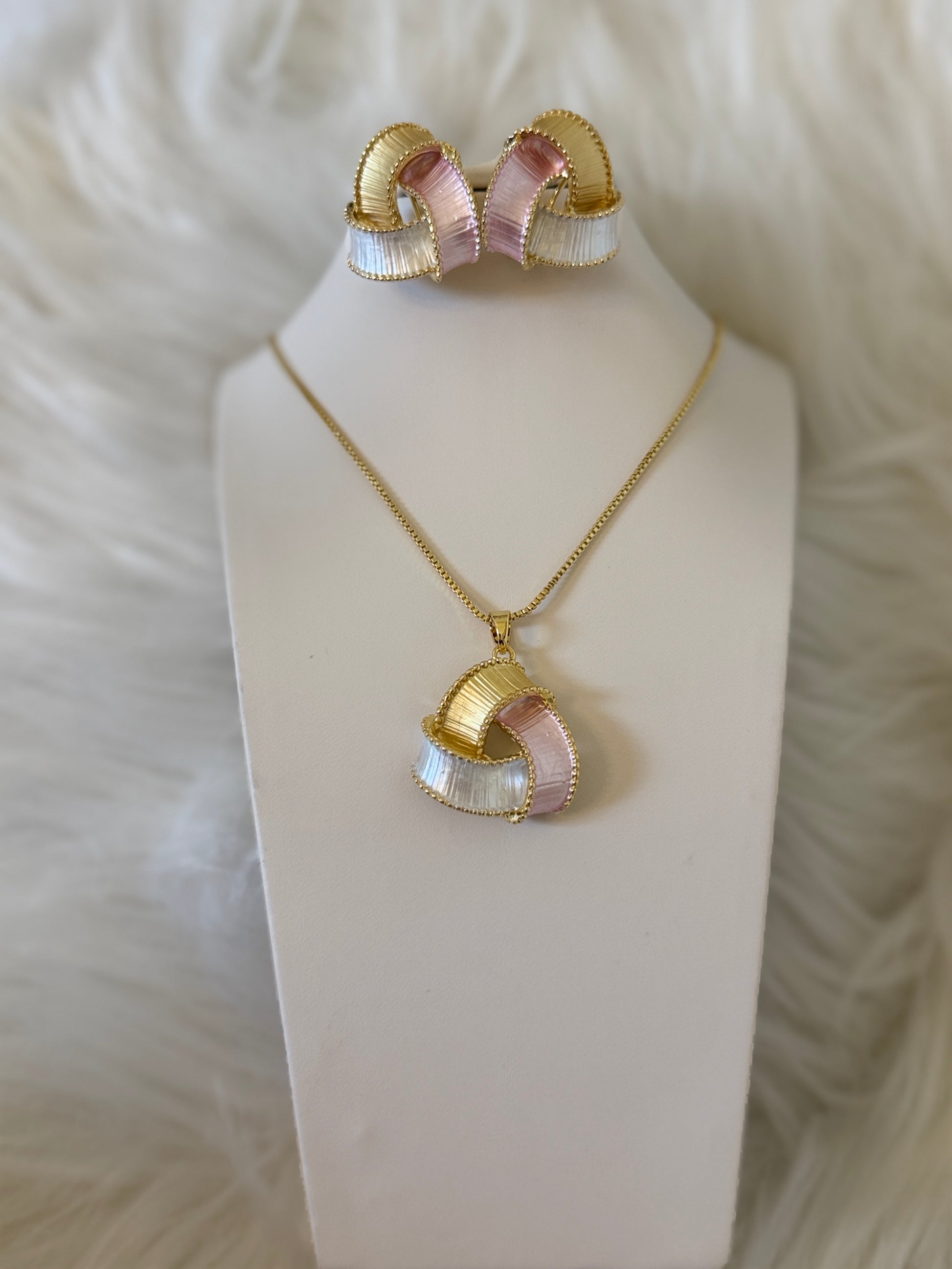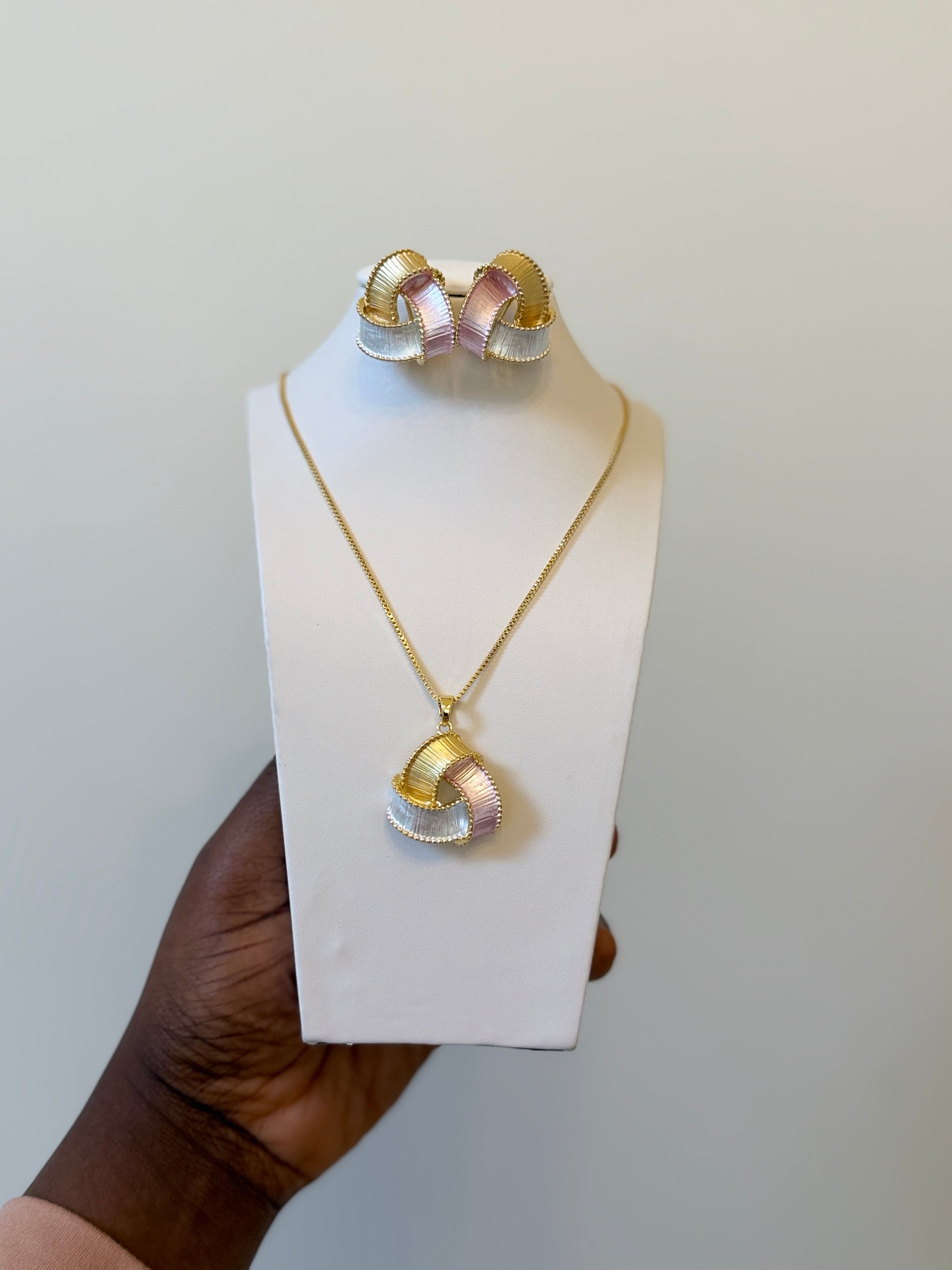 The Trinity Glow Jewelry Set is a stunning blend of elegance and modern design. Featuring a sculptural loop motif in soft blush pink, pearly white, and radiant gold tones, this set is designed to elevate both everyday and special-occasion looks. The textured finish adds dimension and a luxe feel without the weight, making it comfortable for all-day wear.